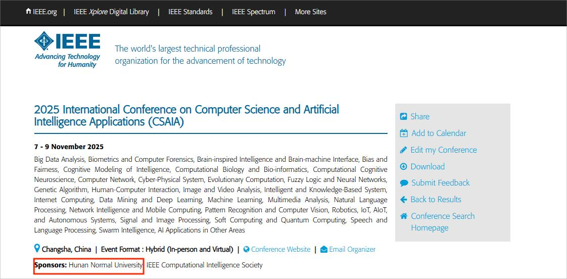 2025计算机科学与人工智能应用国际会议(2025 International Conference on Computer Science and Artificial Intelligence Applications,简写:CSAIA 2025)将于2025年11月7-9日在湖南长沙召开,会议由湖南师范大学和亚洲计算智能学会共同主办、湖南师范大学信息科学与工程学院和湖南师范大学工程与设计学院进行承办、IEEE Computational Intelligence Society (IEEE CIS)提供技术支持。会议将聚焦于计算机科学和人工智能应用领域的前沿发展,旨在促进全球范围内的信息交流与科技创新,加强中外学术合作,共同推动计算机科学与人工智能技术的深入研究与广泛实践。目前会议已进入IEEE官方会议列表和CIS会议列表:https://conferences.ieee.org/conferences_events/conferences/conferencedetails/65930