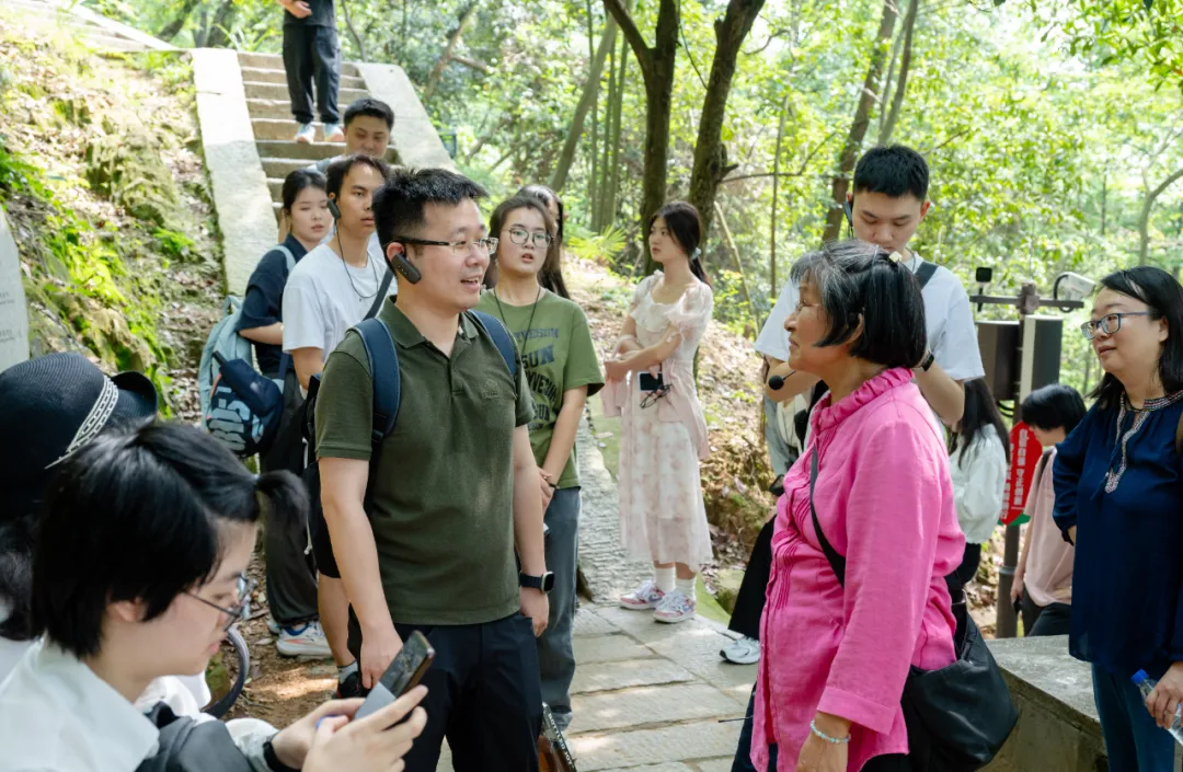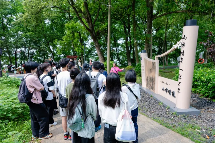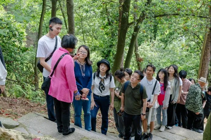 在生成式人工智能指引下,学生们沿着石阶拾级而上,前往“前山古道”“伟人亭”等不同景点实践考察,比对课前通过训练各类生成式人工智能所得到的关于“山市晴岚”的介绍与实景差异。