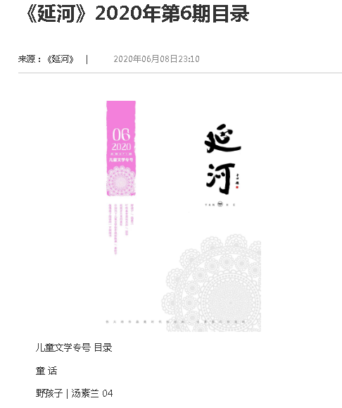 2020年5月29日,《延河》第六期刊载汤素兰所撰童话《野孩子》,积极呼吁:保护穿山甲,保护濒危动物也是保护我们自己。