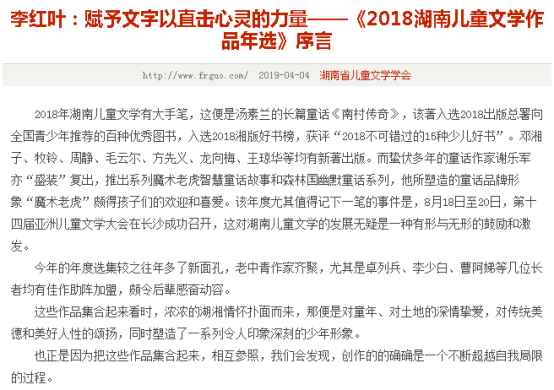 2019年6月,湖南少年儿童出版社刊发李红叶所撰《赋予文字以直击心灵的力量——<2018湖南儿童文学年选>序言》,细致地梳理、剖析了2018年湖南儿童文学的写作概况,并表达了真挚的祝福。