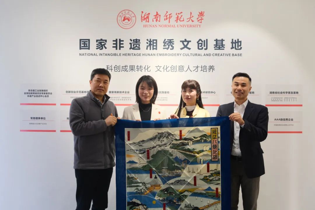 其间,荻野大先生代表日本滋贺县湖南代表处赠予湘绣文创基地滋贺县《近江八景之图》文创产品。孙舜尧教授代表湘绣文创基地回赠长沙市非物质文化遗产湘绣项目代表性传承人肖瑛代表作——《潇湘八景》。