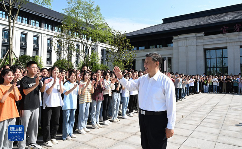 6月8日,中共中央总书记、国家主席、中央军委主席习近平在四川考察。这是8日下午,习近平在宜宾学院考察时,向师生们挥手致意。(新华社记者 谢环驰/摄)