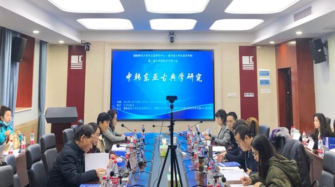 1月7日,湖南师范大学东北亚研究中心、湖南师范大学外国语学院与韩国成均馆大学东亚学术院共同举办第二届“中韩东亚古典学研讨会”。本次会议采用“线上(Zoom网络会议)+线下”方式进行,厦门大学、延边大学、曲阜师范大学、南京师范大学、复旦大学及韩国成均馆大学、釜山大学、檀国大学、韩国学中央研究院等高等院校学者专家一百多人参加了本次会议。湖南师范大学外国语学院院长曾艳钰,韩国成均馆大学东亚学术研究院院长金慶浩(线上)出席开幕式并致辞。东北亚研究中心主任蔡美花与韩国成均馆大学东亚学术院教授孫成俊(线上)共同主持了本次会议。