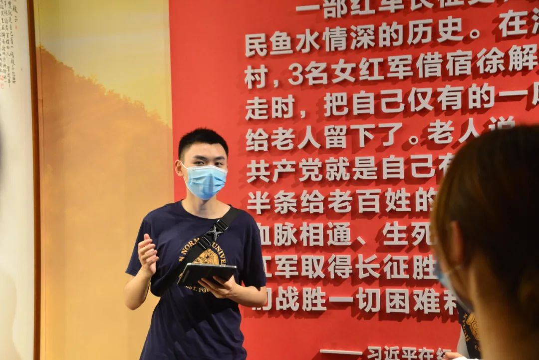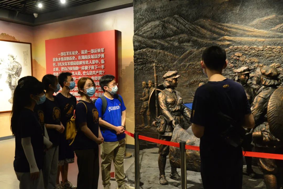 仲夏沙洲,碧空如洗。从当年接过红军“半条被子”,到如今整村走上“幸福路子”,看着一排排整齐的屋舍上挂着的闪耀红星,调研队员们真切感受到沙洲村这片红色热土上始终如一的温暖。调研中,同学们先后前往“半条被子的温暖”专题陈列馆、“半条被子”故事发生地旧址、民俗广场等地,结合史料在历史现场重温波澜壮阔的长征路,体味共产党人“一枝一叶总关情”的初心和本色。