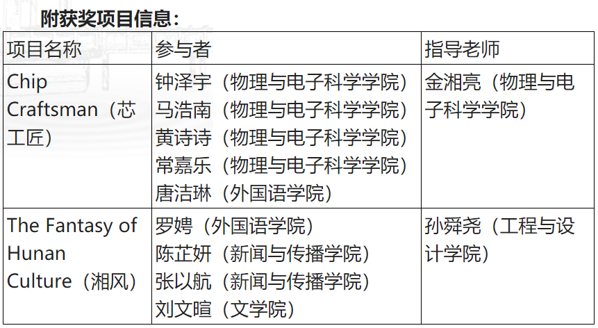 我校物理与电子科学学院本科生钟泽宇等负责的项目“Chip Craftsman”(芯工匠)获大赛一等奖,外国语学院本科生罗娉等负责的项目“The Fantasy of Hunan Culture”(湘风)获大赛三等奖。