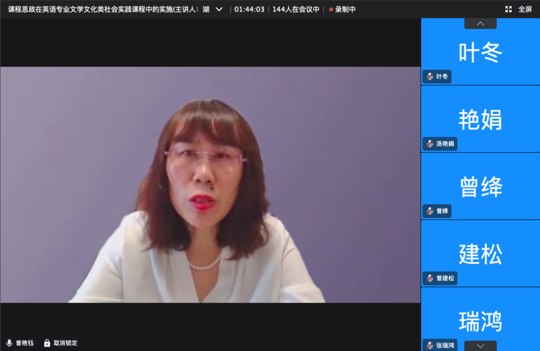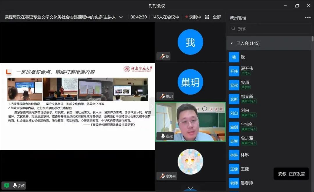 近日,教育部首批虚拟教研室建设点“文学文化课程虚拟教研室”通过钉钉线上平台举行专题教研交流活动。会议由外国语学院院长曾艳钰教授主持,语言与文化研究院副院长杨安主讲,来自全国各地多所高校的160余名英语专业的文学文化类课程授课教师参加会议。